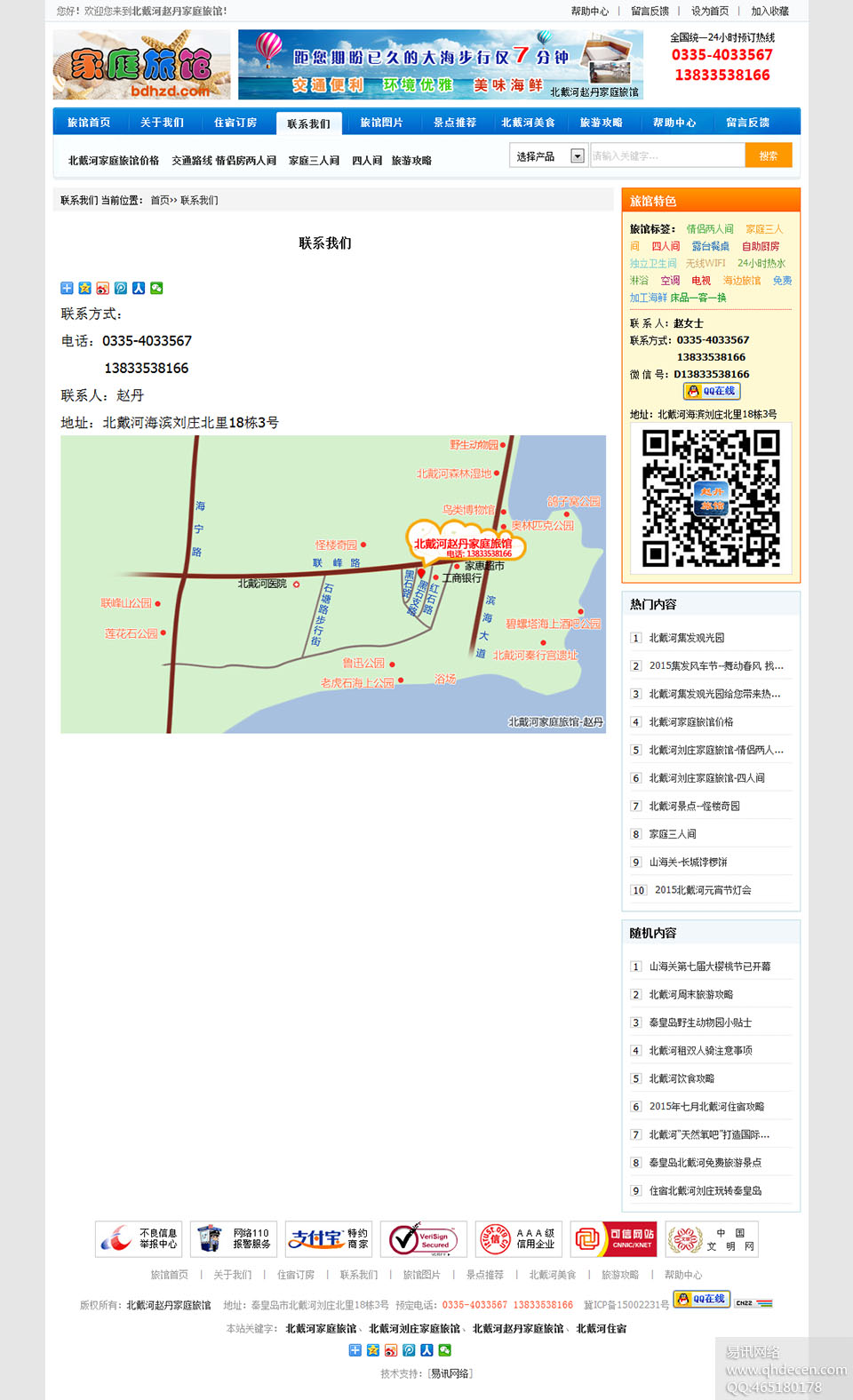 北戴河赵丹家庭旅馆位于中外驰名的避暑胜地北戴河核心地段刘庄。交通便利,环境优雅,距您期盼已久的大海步行仅7分钟。旅馆的房间都是标准房间,均带有空调,彩电,独立卫生间,全天热水淋浴,wifi无线网。有二人、三人、标间和情侣间、家庭间,供您选择。床上用品一客一换。餐饮服务: 海鲜免费加工。娱乐服务: 无线宽带端口,提供打折景点门票。 商务服务: 提供接站、旅游车,南戴河一日游、山海关一日游往返(均为空调大巴车)。其他服务: 代购返程车票 提供各种旅游咨询。赵丹家庭旅馆是十星级文明户。20多年诚信经营的老字号旅店,舒适的住宿环境,周到的住宿服务。