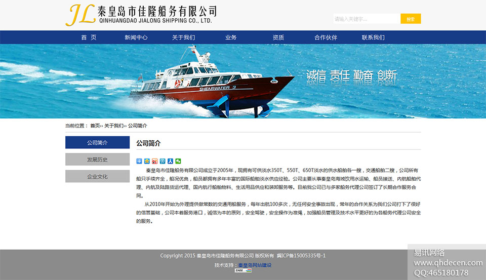 秦皇岛市佳隆船务有限公司成立于2005年,现拥有可供淡水350T、550T、650T淡水的供水船舶各一艘,交通船舶二艘,公司所有船只手续齐全,船况
