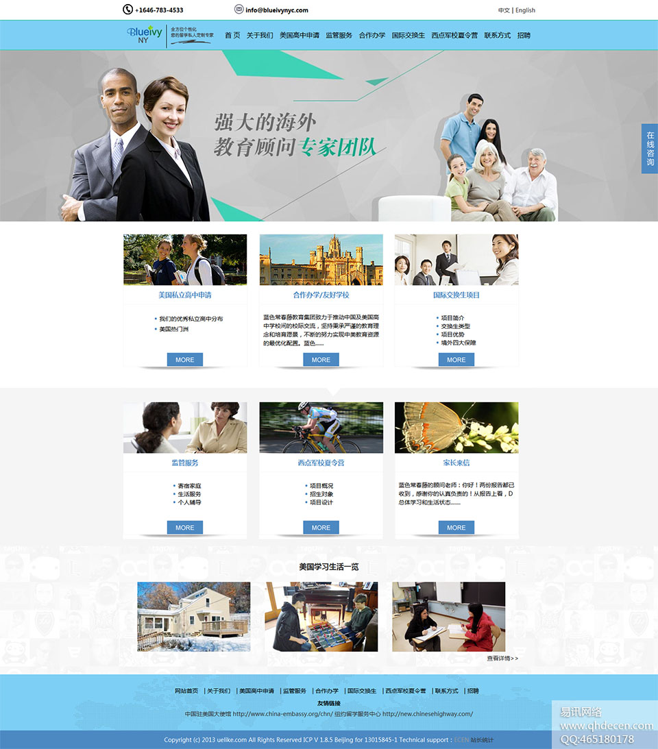 包括:美国东西部夏冬令营、暑期集训班、初高中留学咨询申请与监管、国际交换生、出国留学培训等服务。蓝色常春藤的独特之处在于,团队成员大多居住于美国