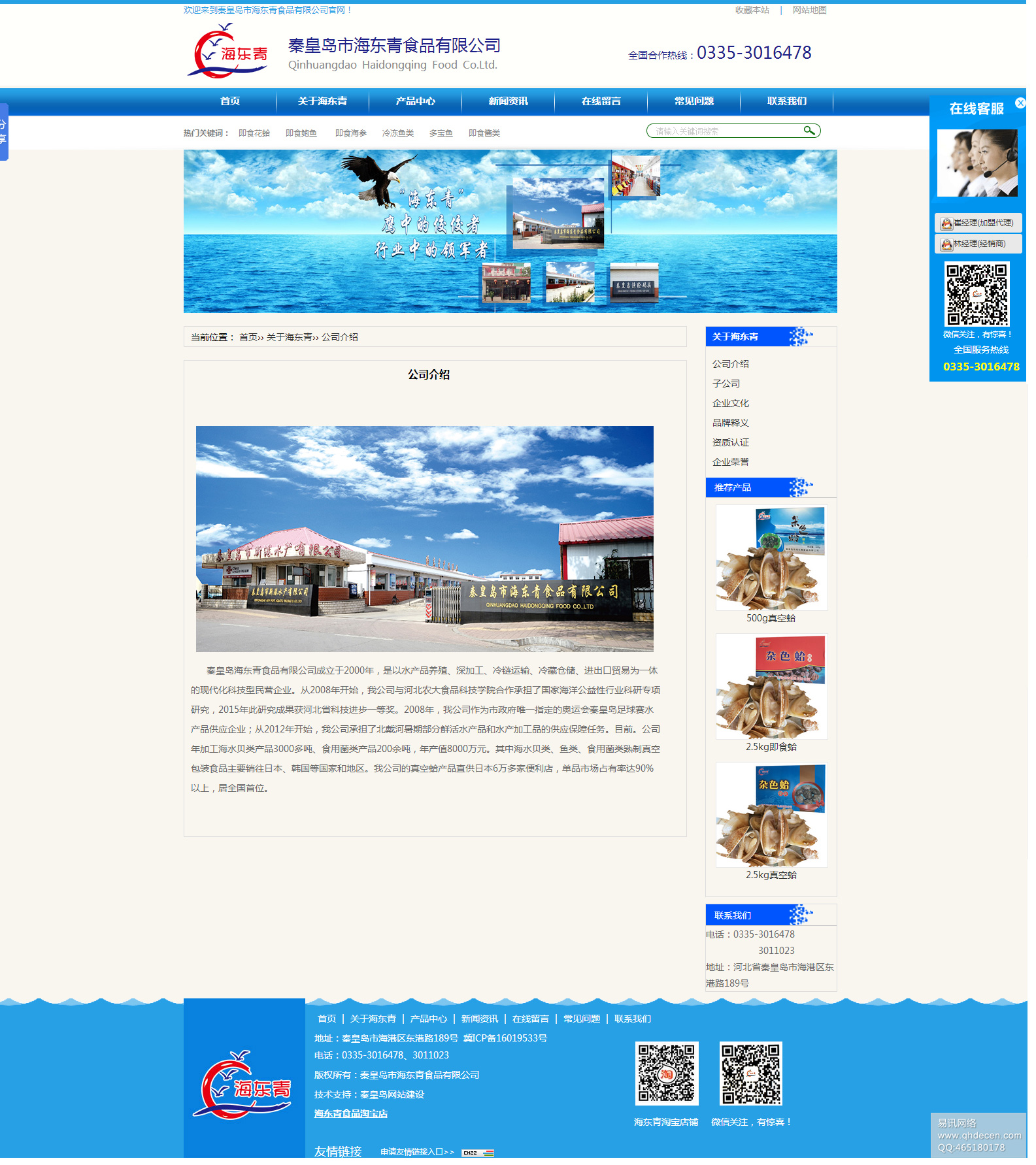 秦皇岛海东青食品有限公司成立于2000年,是以水产品养殖、深加工、冷链运输、冷藏仓储、进出口贸易为一体的现代化科技型民营企业。从2008年开始,我公司与河北农大食品科技学院合作承担了国家海洋公益性行业科研专项研究,2015年此研究成果获河北省科技进步一等奖。2008年,我公司作为市政府唯一指定的奥运会秦皇岛足球赛水产品供应企业;从2012年开始,我公司承担了北戴河暑期部分鲜活水产品和水产加工品的供应保障任务。目前。公司年加工海水贝类产品3000多吨、食用菌类产品200余吨,年产值8000万元。其中海水贝类、鱼类、食用菌类熟制真空包装食品主要销往日本、韩国等国家和地区。公司的真空蛤产品直供日本6万多家便利店,单品市场占有率达90%以上,居全国首位。