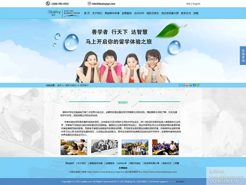 蓝色常春藤纽约教育集团股份有限公司(Blue Ivy NY Education Group Inc)是美联邦政府正式注册下的国际教育机构,总部设在纽约,分部设在波士顿,我公司根据其特点设计了这款既符合国内浏览习惯又符合国际标准的网站页面,所有的细节,甚至一些背景底纹都是经过设计师用心设计,网站整体风格一致,极具国际范儿!让人忍不住看了又看!如果您家里或者身边的朋友正好有留学的计划,不仿到这个网站看看吧。