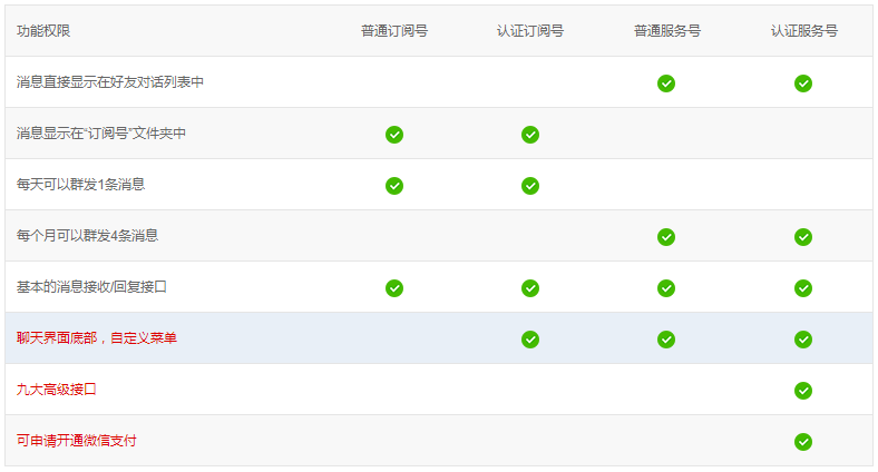 不同类型的公众号所具备的功能权限是不一样的,主要区别: